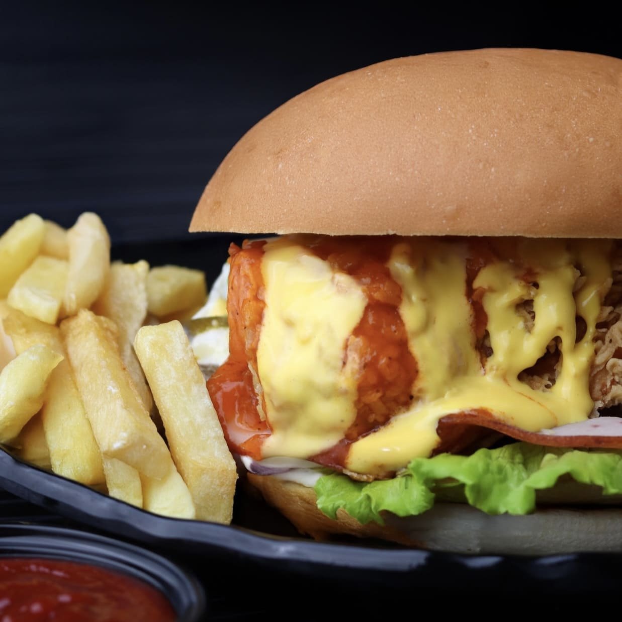 قطعة دجاج بخلطة سبايسي الرائعة مقلية تقدم مع مايونيز و هالبينو وأوراق الخس و روستو مدخن و أصابع البطاطا الذهبية و سلطة كول سلو و كتشب