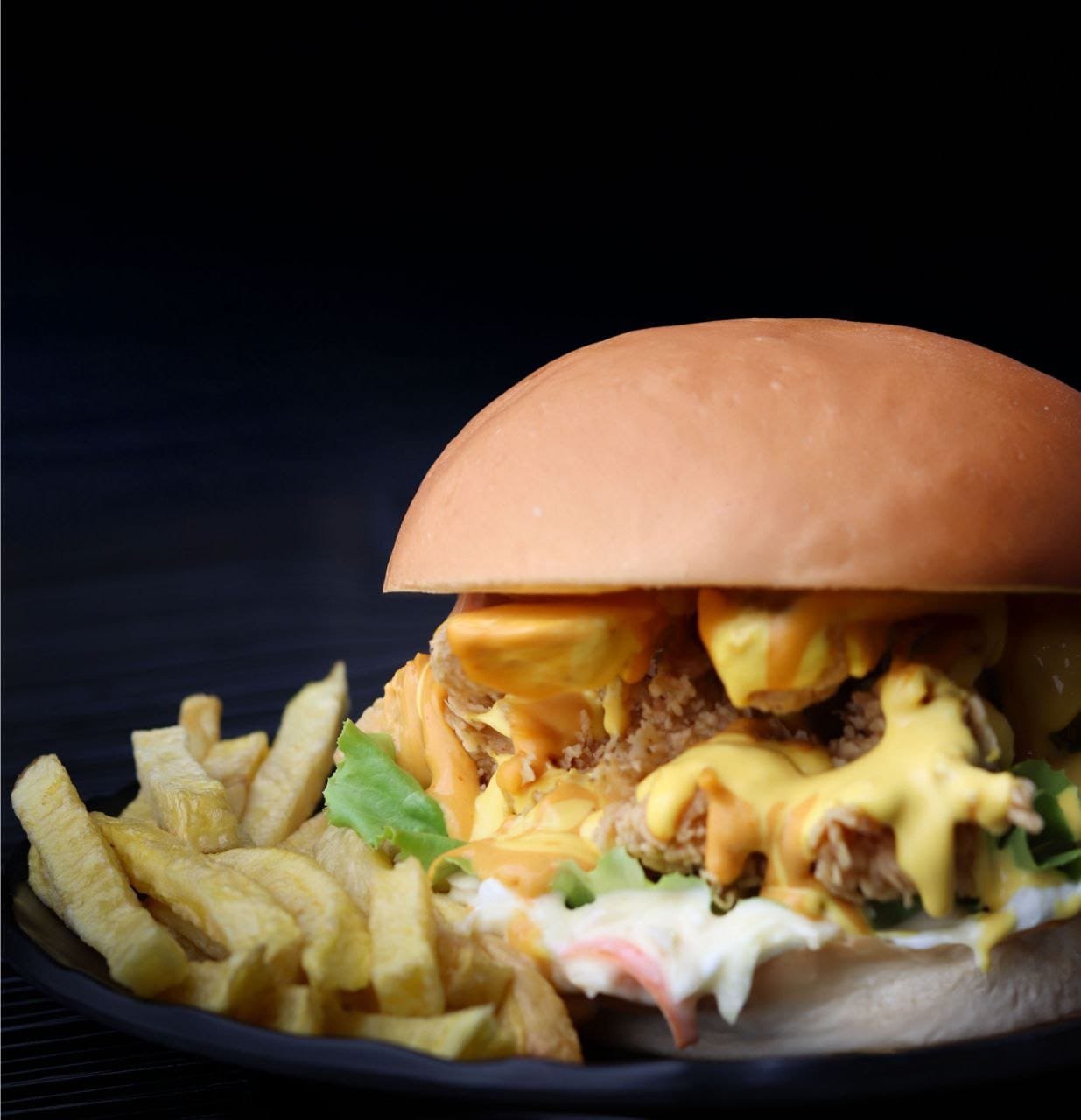 قطع من الدجاج المقلي المقرمش مع الموزاريلا المقلية تقدم مع صوص سريراتشا و جبنة الشيدر و أصابع البطاطا و مايونيز و سلطة كول سلو
