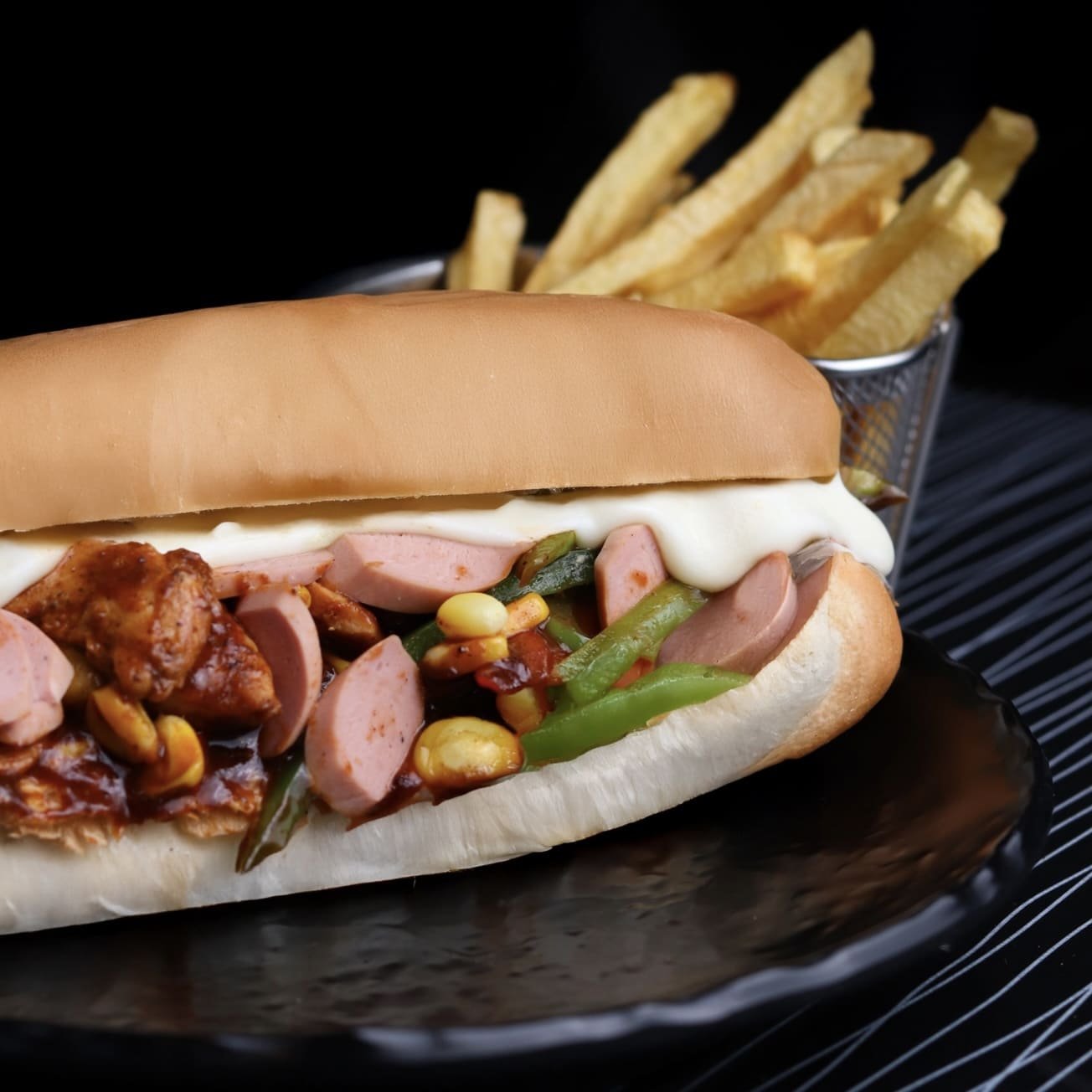 قطع دجاج مشوية مع هوت دوغ وموزاريلا و مزيج الخضار من الفليفلة والذرة و صوص باربكيو و مايونيز تقدم مع أصابع البطاطا و سلطة كول سلو و كتشب