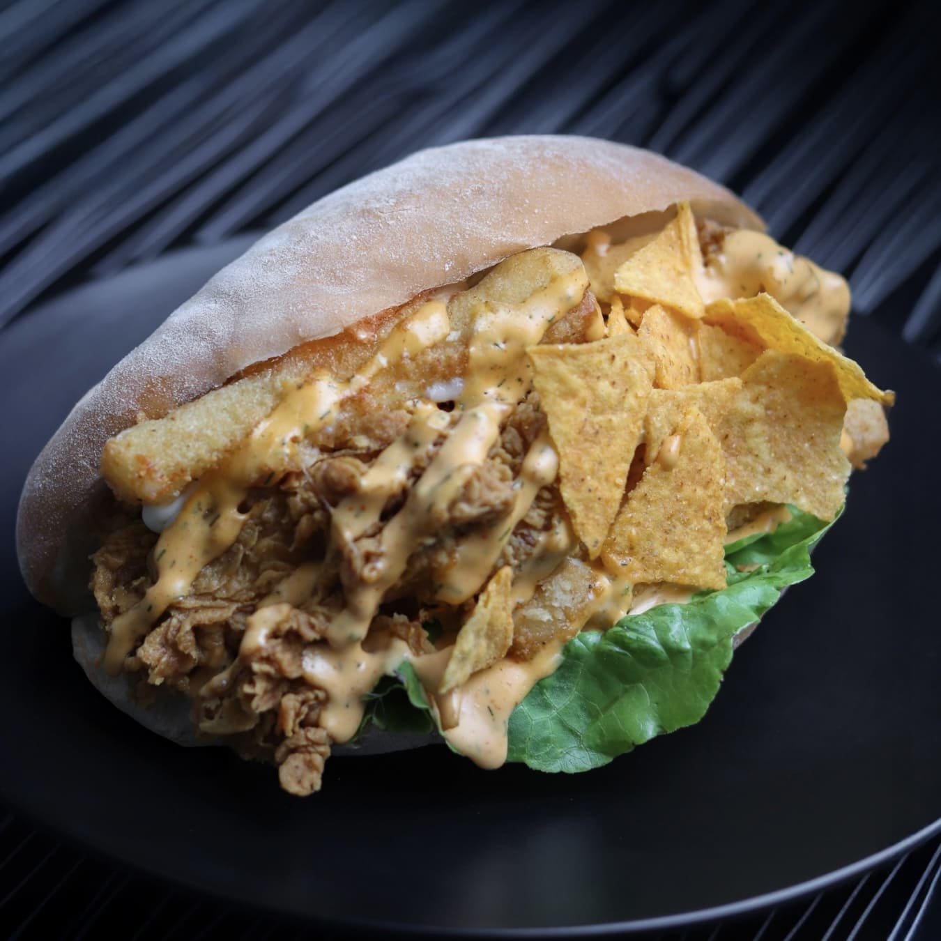 قطع دجاج مقرمش مع اصابع موزاريلا مقلية مع صوص تكساس الحار وقطع ناتشوز اللذيذة