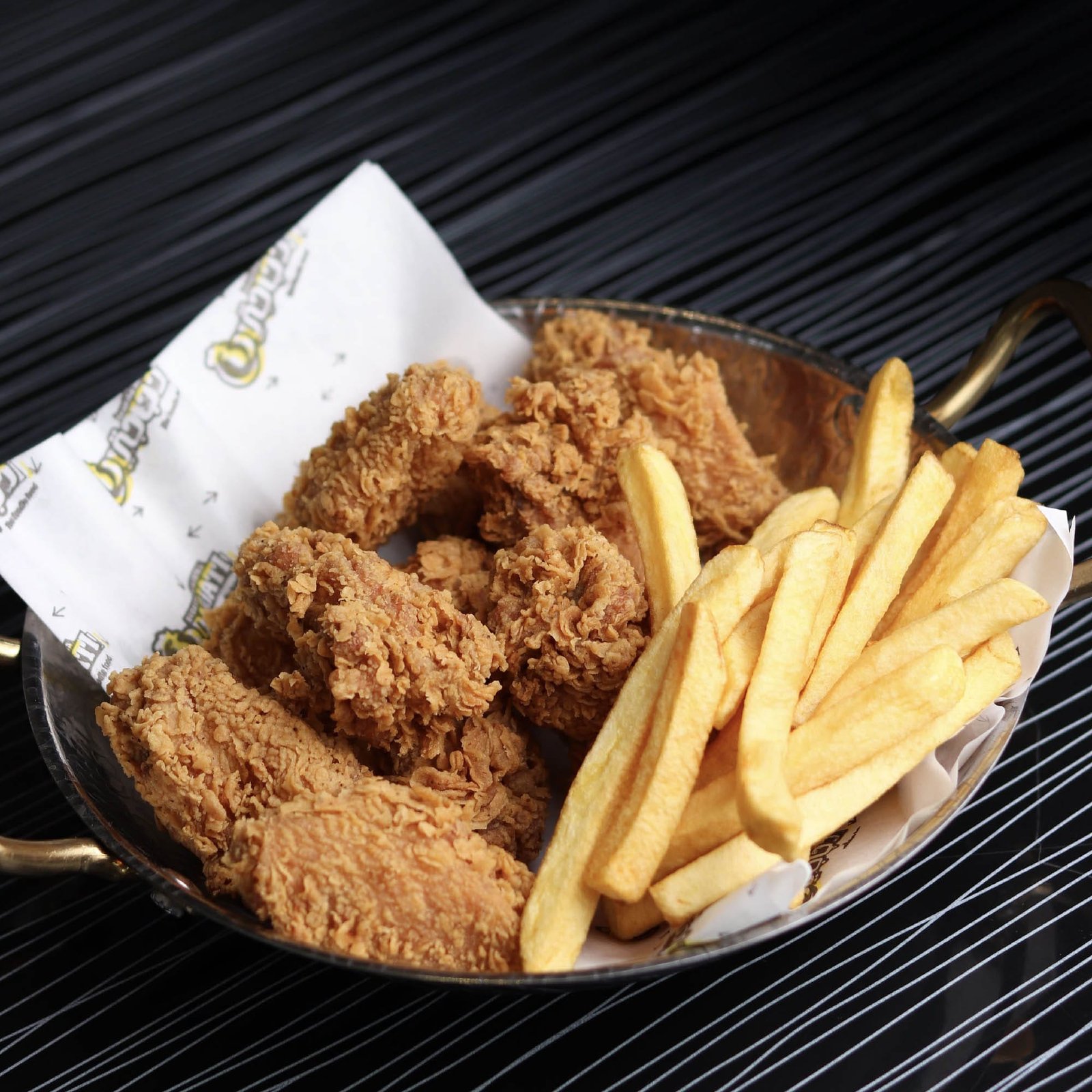 قطع عدد 10 من الجوانح المقرمشة تقدم مع بطاطا و كريم ثوم و مخلل و كول سلو و كتشب