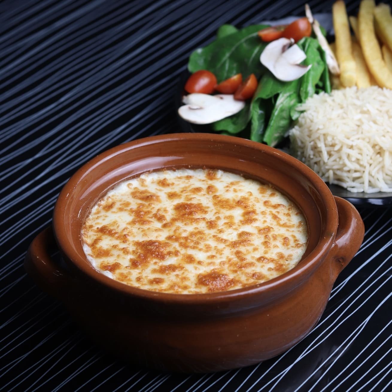 قطع من الدجاج بالخلطة اللذيذة مع صوص الكريم و الذرة وفطر فريش مع جبنة موزاريلا الذائبة تقدم مع أصابع البطاطا و الأرز الابيض